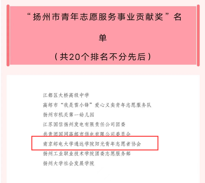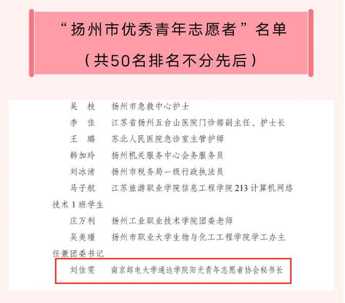 近日,2022年度全市青年志愿者行动先进典型寻访结果公布。永利官网21级计算机科学与技术(嵌入式培养)刘佳雯同学荣获“扬州市优秀青年志愿者”、阳光青年志愿者协会荣获“扬州市青年志愿服务事业贡献奖”。